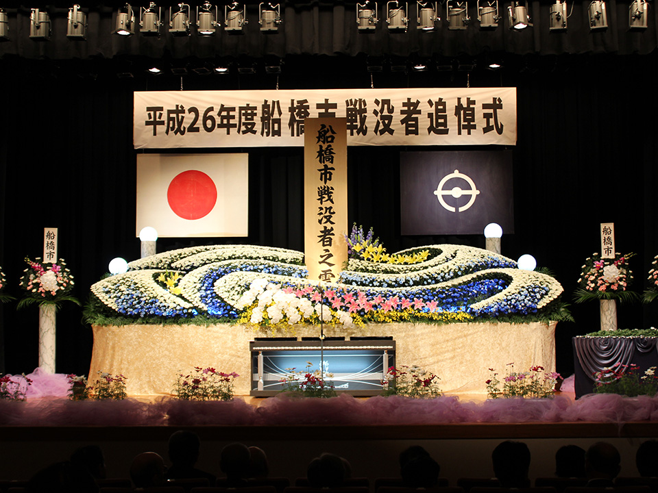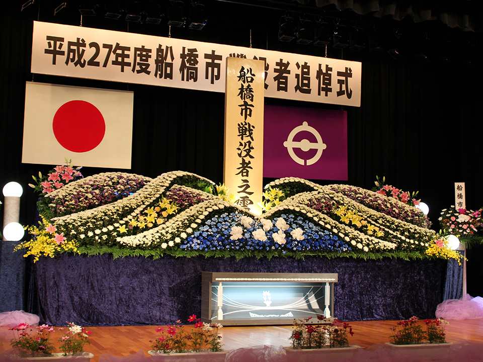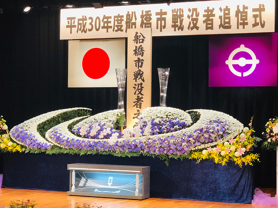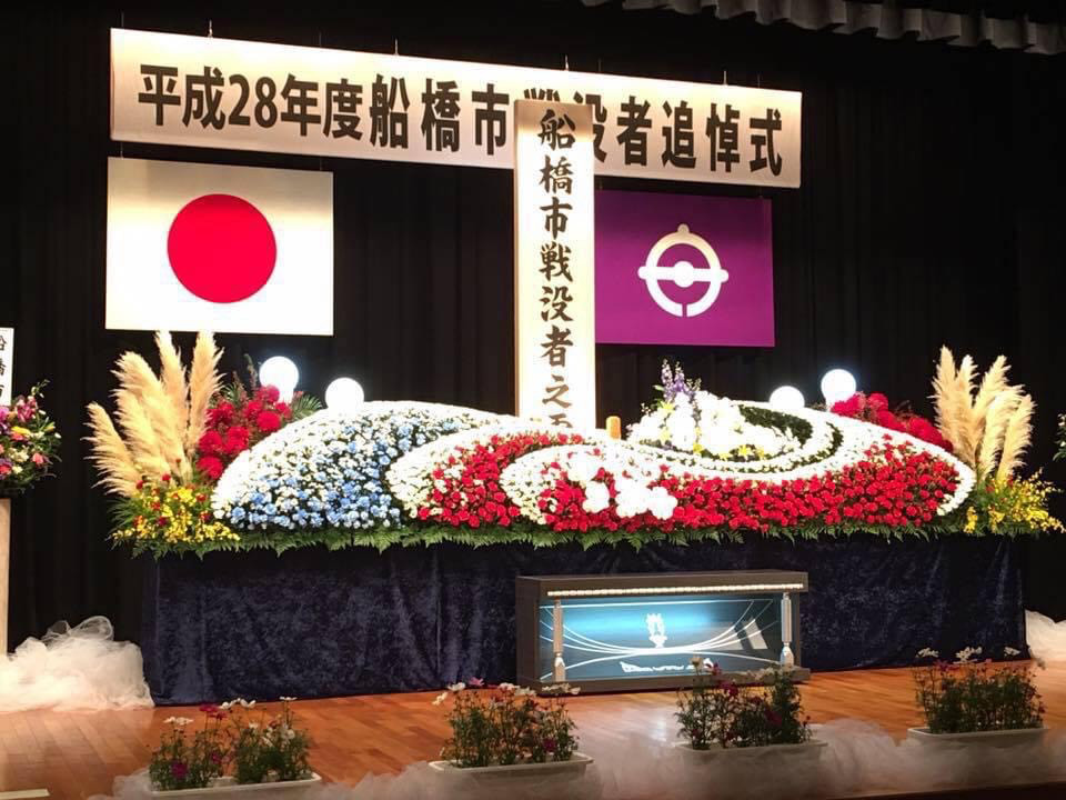 株式会社セレブは毎年、船橋市戦没者追悼式を施行させていただいております。 船橋市勤労市民センターにて船橋市長をはじめ各政界の方々とたくさんの遺族会の皆様が参列されます。 遺族会の方々から「今年も素敵な花祭壇を設営していただき、ありがとうございます」と心温まるお褒めの言葉を頂戴しております。